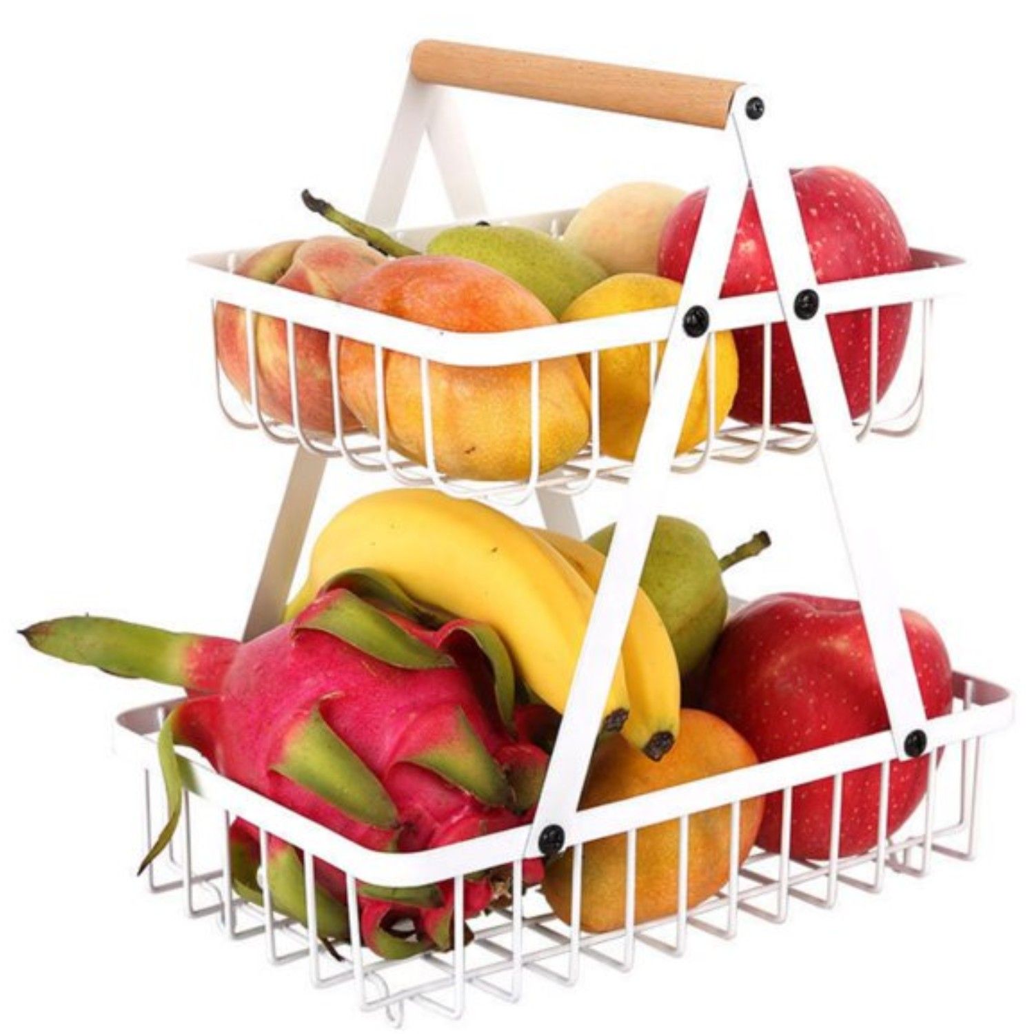 2 Tier Fruit Basket Countertop Fruit Vegetable Basket Bowl for Kitchen is the perfect way to artfully store your produce and save counter space. Multifunctional vegetable basket; each layer has a large capacity; can organize fruits; and can also store vegetables; bread; snacks; candies; etc. Double-layer design; effective use of space. If you only need one basket; you can take it apart and use it. The basket has a wooden carrying handle; which is easy to move and beautiful.