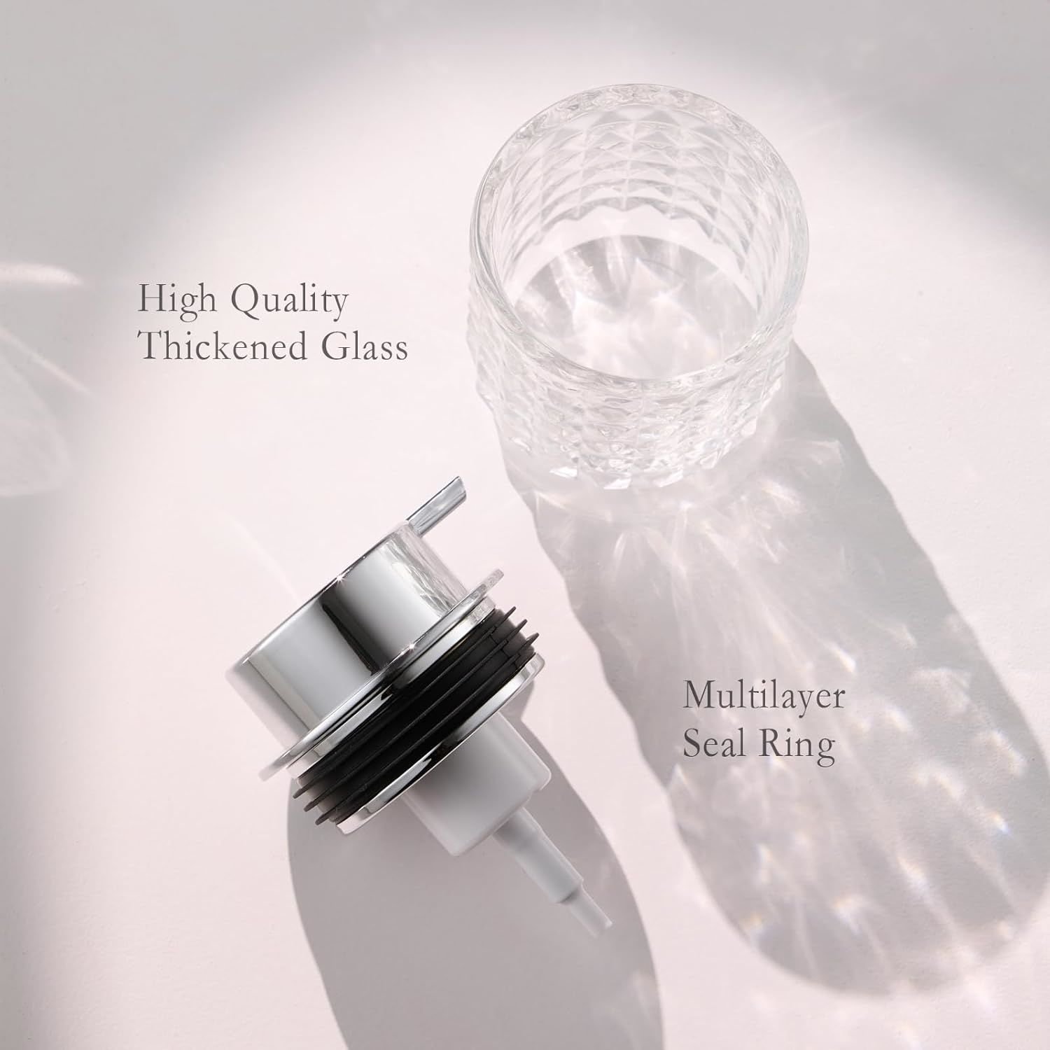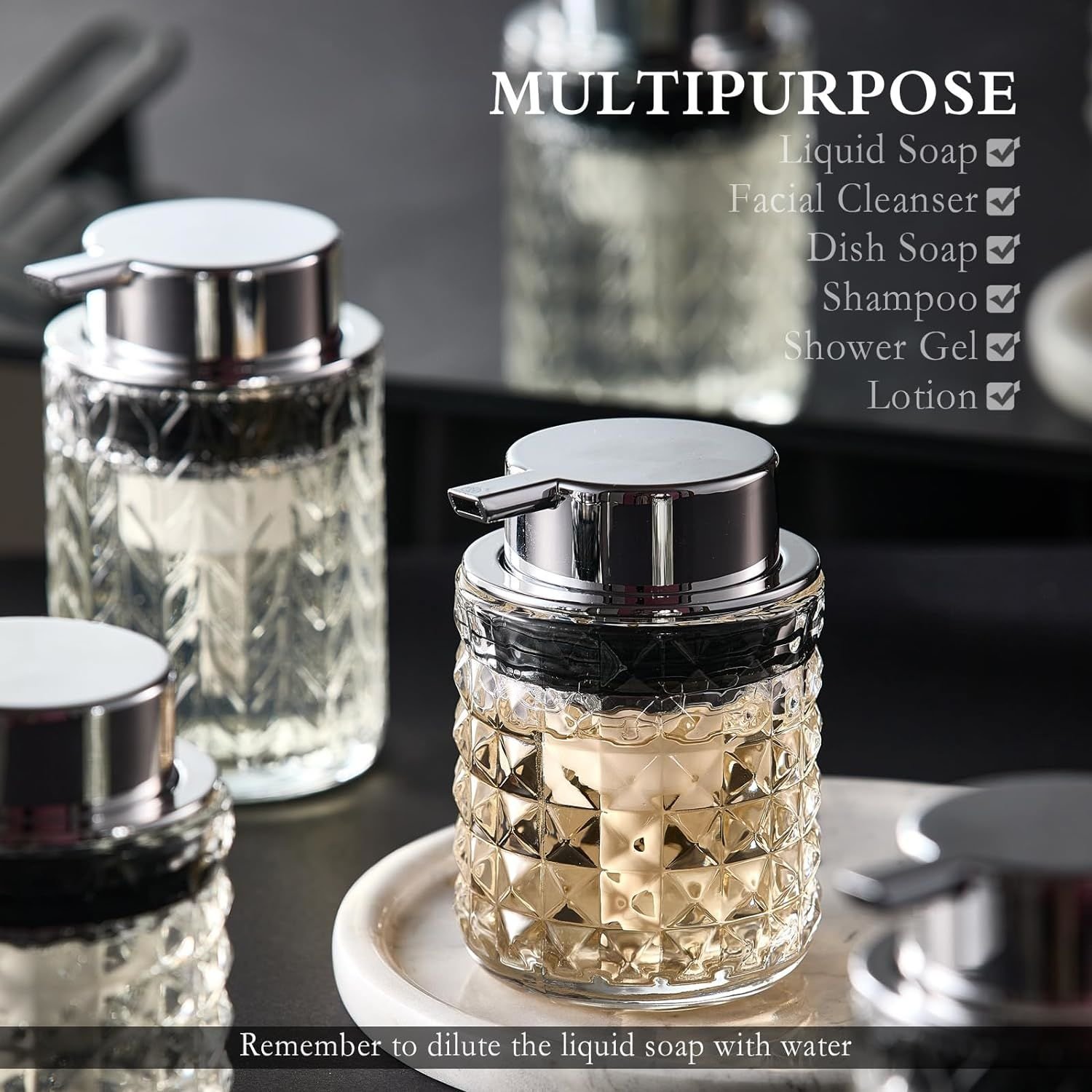 2.High-End Craftsmanship: This soap dispenser, featuring a robust clear glass body and a silver pump, is designed to endure daily use while maintaining its stylish appeal. A prime mix of durability and design excellence.(1 part liquid soap and about 2 - 5 parts water, or using foaming soap refill.)