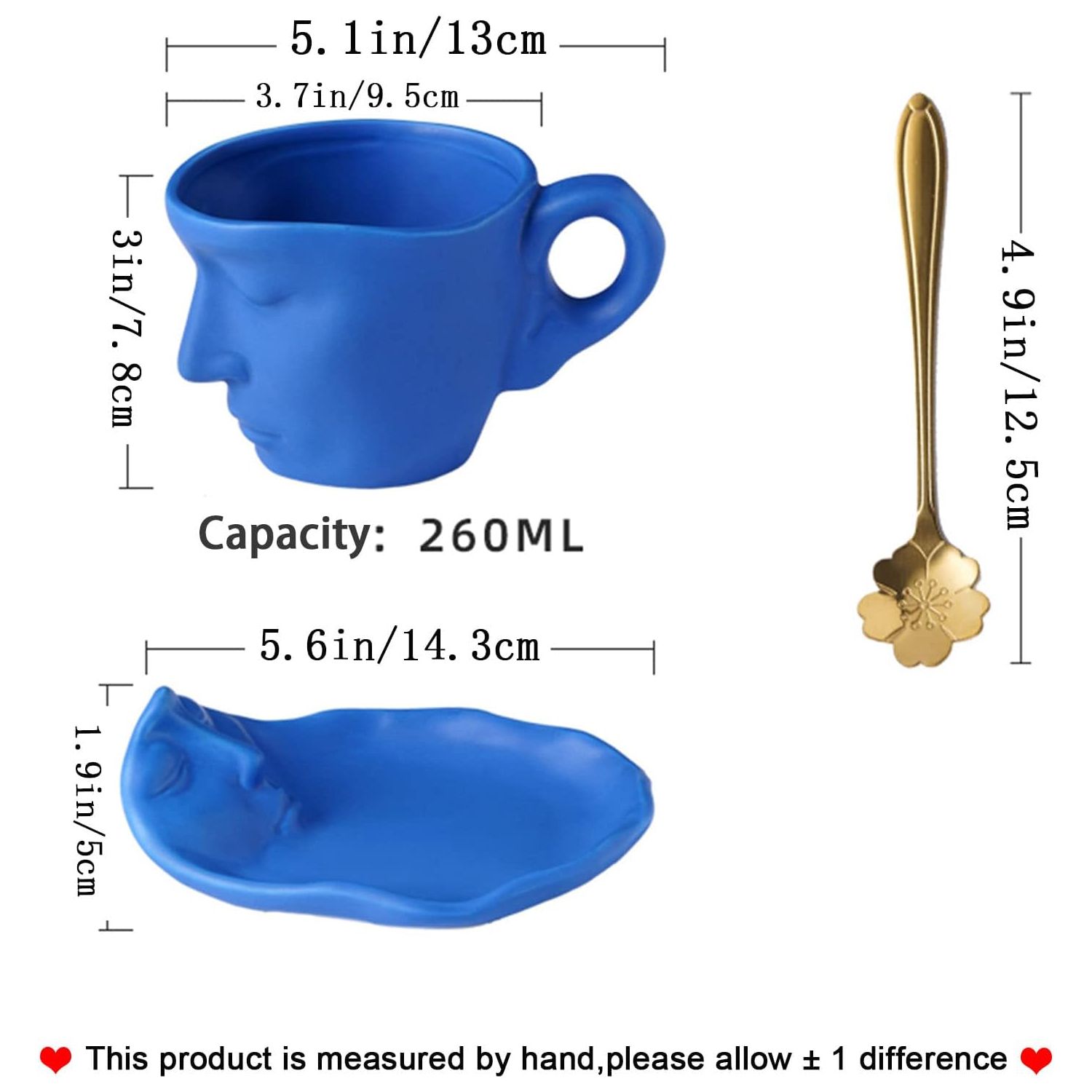 KISSING MUG; The teacup and saucer are made of heat-resistant, porcelain made of high-quality clay that can withstand the temperature of hot drinks; it has a sufficient capacity of 8.5 ounces. Includes 1 cup, 1 saucer and 1 tablespoon
