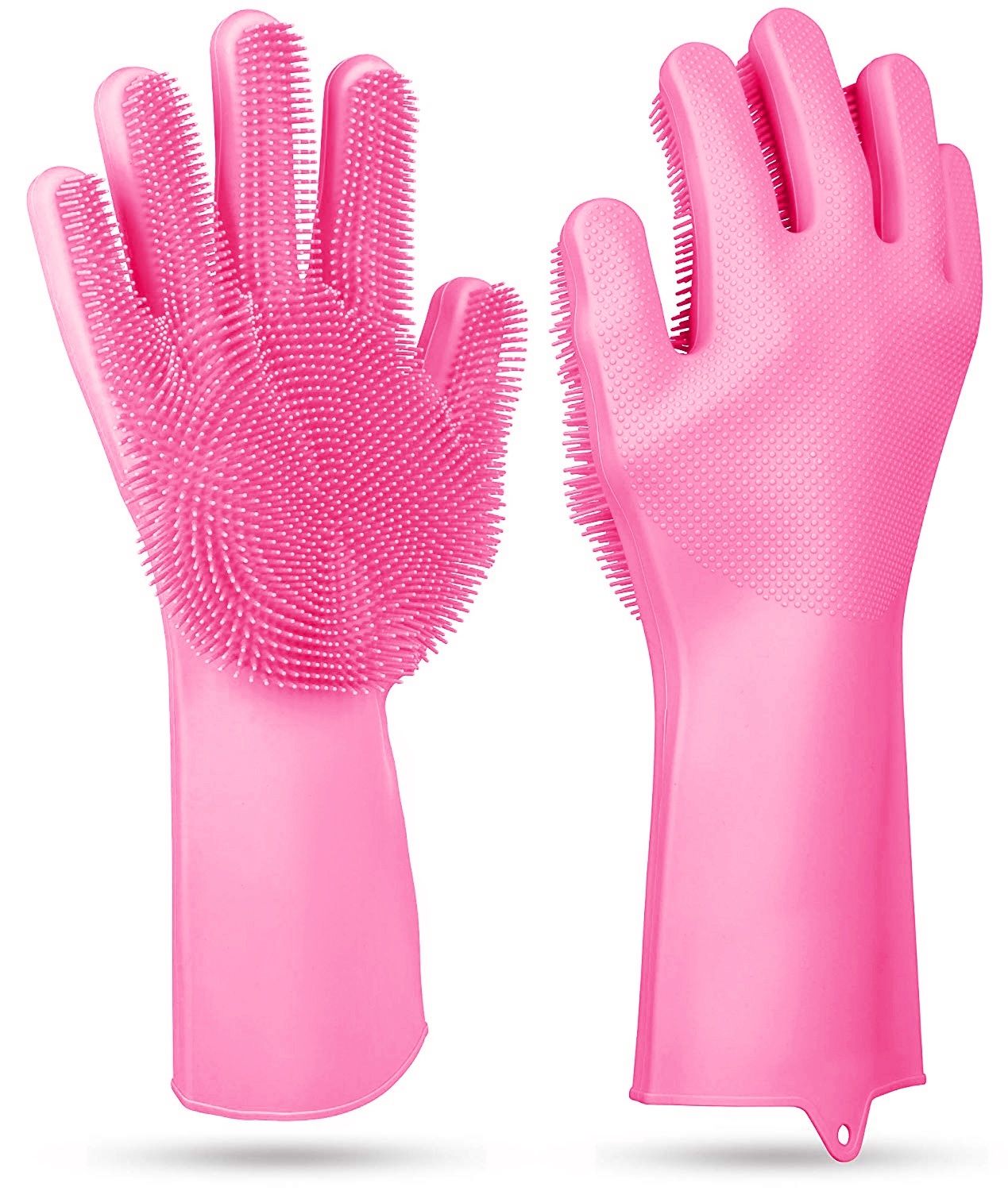 **STRONG CLEANING PERFORMANCE*:Separate 5 fingers to increase cleaning flexibility. At one side of the gloves is filled with .2inches-length(finger part)//0.4inches-length(palm part) thick and soft silicone bristles and at the other side of the gloves overspreads non-slip round points to effectively remove residuals.