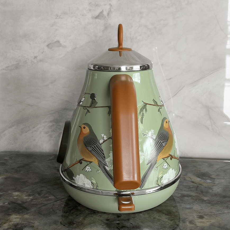 SKU: PS3013T Flower watermarking painted electric kettle retro with thermometer water heater 1850W electric kettle SUS304 LED lamp capacity 1.7L wide outlet design water filter spout can add water design high safety instrument dial thermometer quick boiling without BPA wire storage base automatically closed and dry cooking protection