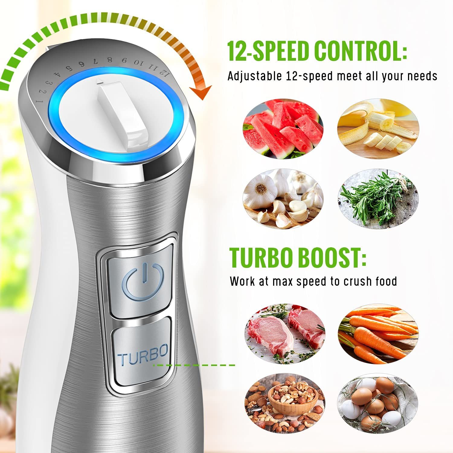 2.Limitless Power: Chop, puree and mix all ingredients to perfection in a flash with 1100W heavy-duty immersion hand blender copper motor. 12-speed/Turbo blending presets give you max control over your cooking