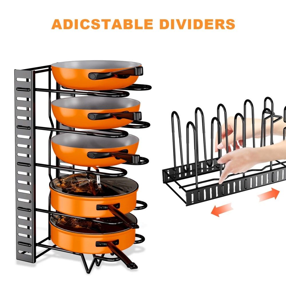 2 Pack Kitchen Cookware Set Organizer:A Neat Kitchen Is Ready with This Pot&Pan Organizer--The pot and pan organizer helps you store pots, pans, lids, cutting boards and other kitchen utensils more conveniently, making your kitchen neat and organized.   This 8-tier pot and pan organizer for cabinets is an adjustable organizer.   You can adjust the height of each tier to accommodate pots and pans of different heights.   This sturdy pot rack is made of heavy-duty, high-quality iron with a black painted finish that gives it enhanced rust resistance for extended use.   The versatility of this cabinet pots and pans organizer is that you can make it stand up or let it lie down.This increases the number of places and ways you can store your pots and pans.